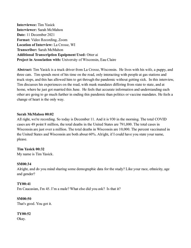 Tim Yasick is a truck driver from La Crosse, Wisconsin. He lives with his wife, a puppy, and three cats. Tim spends most of his time on the road, only interacting with people at gas stations and truck stops, and this has allowed him to get through the pandemic without getting sick. In this interview, Tim discusses his experiences on the road, with mask mandates differing from state to state, and at home, where he just got married this June. He feels that accurate information and understanding each other are going to go much further in ending this pandemic than politics or vaccine mandates. He feels a change of heart is the only way.