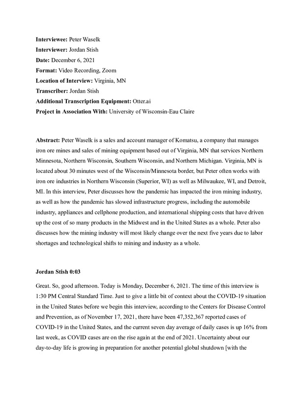 Peter Waselk is a sales and account manager of Komatsu, a company that manages iron ore mines and sales of mining equipment based out of Virginia, MN that services Northern Minnesota, Northern Wisconsin, Southern Wisconsin, and Northern Michigan. Virginia, MN is located about 30 minutes west of the Wisconsin/Minnesota border. Still, Peter often works with iron ore industries in Northern Wisconsin (Superior, WI) as well as Milwaukee, WI, and Detroit, MI. In this interview, Peter discusses how the pandemic has impacted the iron mining industry, as well as how the pandemic has slowed infrastructure progress, including the automobile industry, appliances and cellphone production, and international shipping costs that have driven up the cost of so many products in the Midwest and the United States as a whole. Peter also discusses how the mining industry will most likely change over the next five years due to labor shortages and technological shifts to mining and industry as a whole.
