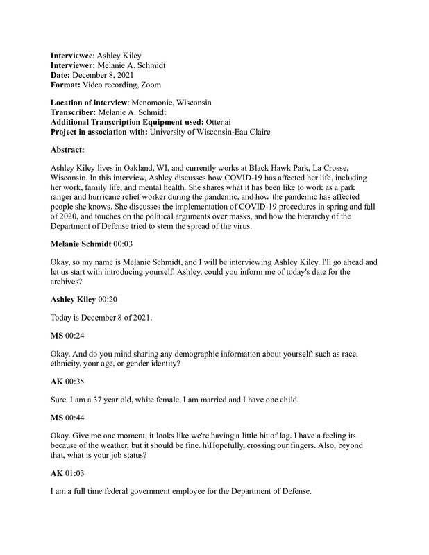 Ashley Kiley lives in Oakland, WI, and currently works at Black Hawk Park, La Crosse, Wisconsin. In this interview, Ashley discusses how COVID-19 has affected her life, including her work, family life, and mental health. She shares what it has been like to work as a park ranger and hurricane relief worker during the pandemic, and how the pandemic has affected people she knows. She discusses the implementation of COVID-19 procedures in spring and fall of 2020, and touches on the political arguments over masks, and how the hierarchy of the Department of Defense tried to stem the spread of the virus.