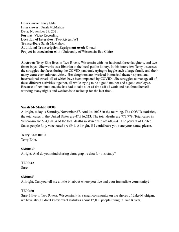 Terry Ehle lives in Two Rivers, Wisconsin with her husband, three daughters, and two foster boys. She works as a librarian at the local public library. In this interview, Terry discusses the struggles she faces during the COVID pandemic trying to juggle such a large family and their many extra-curricular activities. Her daughters are involved in musical theater, sports, and international travel- all of which have been impacted by COVID. She struggles to manage all of these different activities together, all while trying to be a good mother and a good employee. Because of her situation, she has had to take a lot of time off of work and has found herself working many nights and weekends to make up for the lost time.