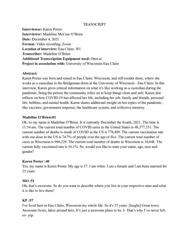 Karen Porter was born and raised in Eau Claire, Wisconsin, and still resides there, where she works as a custodian in the Bridgeman dorm at the University of Wisconsin - Eau Claire. In this interview, Karen gives critical information on what it’s like working as a custodian during the pandemic, being the person the community relies on to keep things clean and safe. Karen also reflects on how COVID-19 has affected her life, including her job, family and friends, personal life, hobbies, and mental health. Karen shares additional insight on hot topics of the pandemic, like vaccines, government response, the healthcare system, and collective memory.