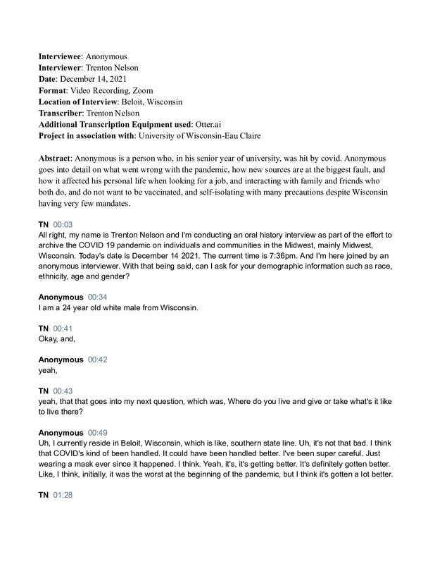 Anonymous is a person who, in his senior year of university, was hit by covid. Anonymous goes into detail on what went wrong with the pandemic, how new sources are at the biggest fault, and how it affected his personal life when looking for a job, and interacting with family and friends who both do, and do not want to be vaccinated, and self-isolating with many precautions despite Wisconsin having very few mandates.
