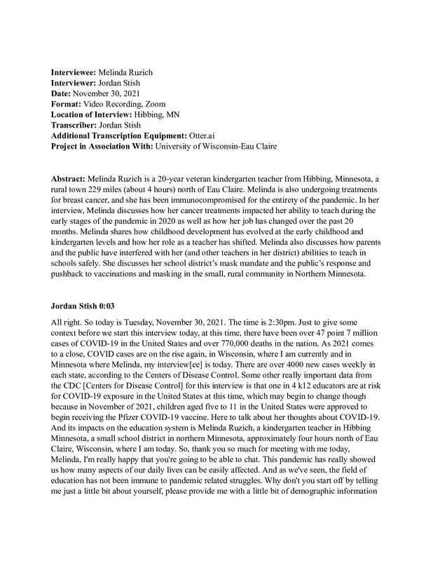 Melinda Ruzich is a 20-year veteran kindergarten teacher from Hibbing, Minnesota, a rural town 229 miles (about 4 hours) north of Eau Claire. Melinda is also undergoing treatments for breast cancer, and she has been immunocompromised for the entirety of the pandemic. In her interview, Melinda discusses how her cancer treatments impacted her ability to teach during the early stages of the pandemic in 2020 as well as how her job has changed over the past 20 months. Melinda shares how childhood development has evolved at the early childhood and kindergarten levels and how her role as a teacher has shifted. Melinda also discusses how parents and the public have interfered with her (and other teachers in her district) abilities to teach in schools safely. She discusses her school district’s mask mandate and the public’s response and pushback to vaccinations and masking in the small, rural community in Northern Minnesota.
