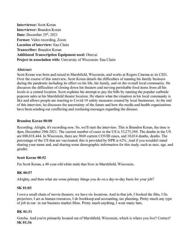 Scott Koran was born and raised in Marshfield, Wisconsin, and works at Rogers Cinema as its CEO. Over the course of this interview, Scott Koran details the difficulties of running his family business during the pandemic including its effect on his life, his family, and on the overall local community. He discusses the difficulties of closing down his theaters and moving perishable food items from all his locals to a central location. Scott explains his attempt to pay the bills by running the popular curbside popcorn sales at his Marshfield theater location. He shares what the situation in his local community is like and allows people are reacting to Covid-19 safety measures created by local businesses. At the end of this interview, he discusses the uncertainty of the future and how the media and health organizations have been sending out conflicting and confusing messages regarding the disease.