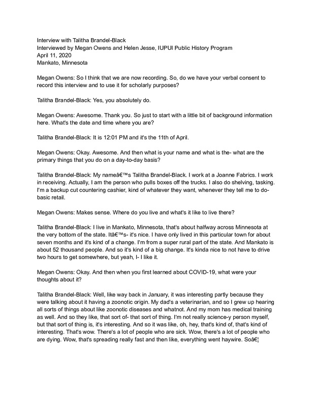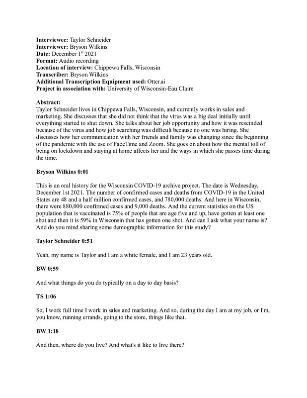 Taylor Schneider lives in Chippewa Falls, Wisconsin, and currently works in sales and marketing. She discusses that she did not think that the virus was a big deal initially until everything started to shut down. She talks about her job opportunity and how it was rescinded because of the virus and how job searching was difficult because no one was hiring. She discusses how her communication with her friends and family was changing since the beginning of the pandemic with the use of FaceTime and Zoom. She goes on about how the mental toll of being on lockdown and staying at home affects her and the ways in which she passes time during the time.