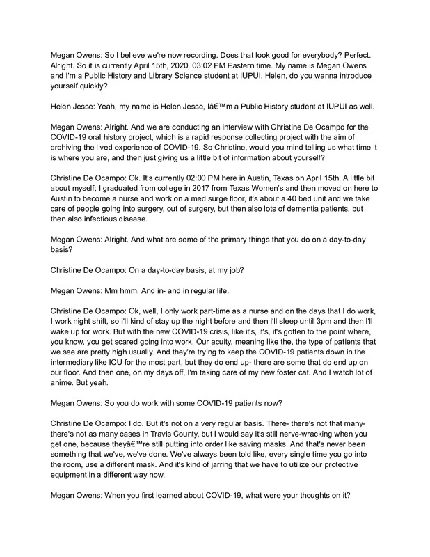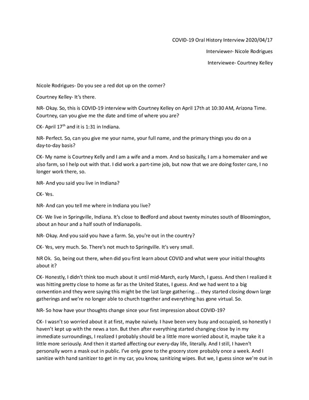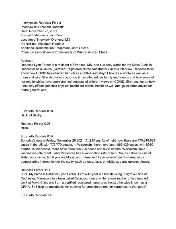 Rebecca Lynn Ferber is a resident of Oronoco, MN, and currently works for the Mayo Clinic in Rochester as a CRNA (Certified Registered Nurse Anesthetist). In this interview, Rebecca talks about how COVID has affected her job as a CRNA and Mayo Clinic as a whole as well as a mom and wife. She also talks about how it has affected her family and friends and how some of her relationships have been strained because of different views on COVID. She touches on how it not only affects people's physical health but mental health as well and gives some advice for future generations.