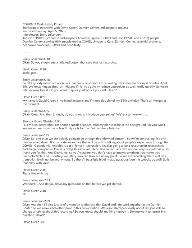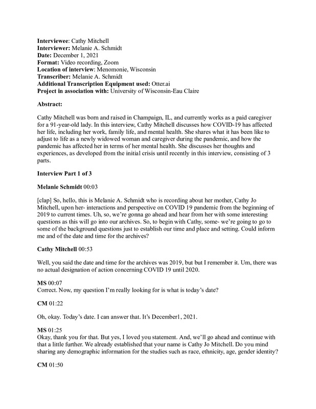 Cathy Mitchell was born and raised in Champaign, IL, and currently works as a paid caregiver for a 91-year-old lady. In this interview, Cathy Mitchell discusses how COVID-19 has affected her life, including her work, family life, and mental health. She shares what it has been like to adjust to life as a newly widowed woman and caregiver during the pandemic, and how the pandemic has affected her in terms of her mental health. She discusses her thoughts and experiences, as developed from the initial crisis until recently in this interview, consisting of 3 parts.