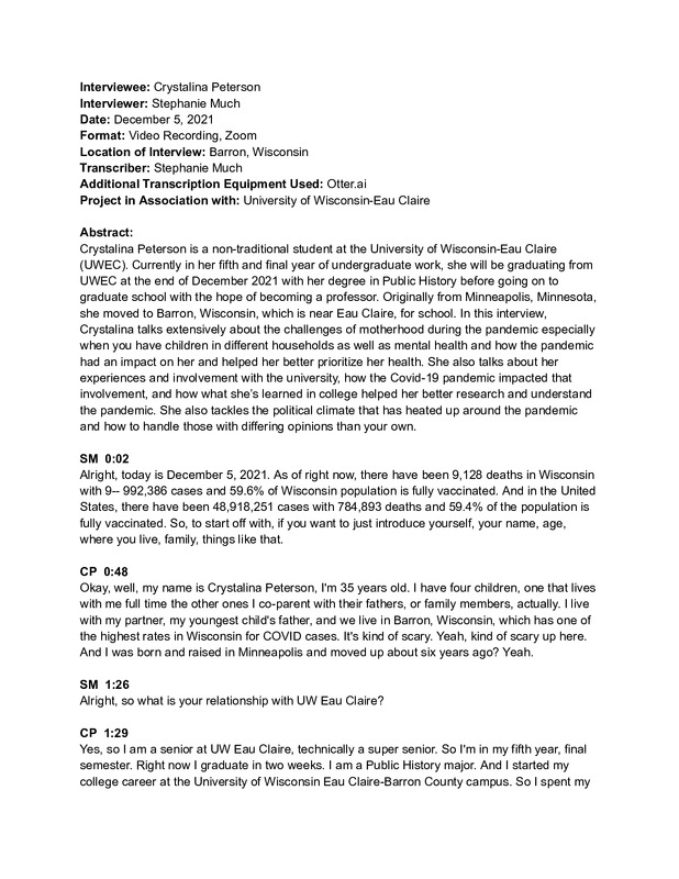 Crystalina Peterson is a non-traditional University of Wisconsin-Eau Claire (UWEC) student. Currently, in her fifth and final year of undergraduate work, she will graduate from UWEC at the end of December 2021 with her degree in Public History before going on to graduate school with the hope of becoming a professor. Originally from Minneapolis, Minnesota, she moved to Barron, Wisconsin, near Eau Claire, for school. In this interview, Crystalina talks extensively about the challenges of motherhood during the pandemic especially when you have children in different households as well as mental health and how the pandemic had an impact on her and helped her better prioritize her health. She also talks about her experiences and involvement with the university, how the Covid-19 pandemic impacted that involvement, and how what she’s learned in college helped her better research and understand the pandemic. She also tackles the political climate that has heated up around the pandemic and how to handle those with differing opinions than your own.