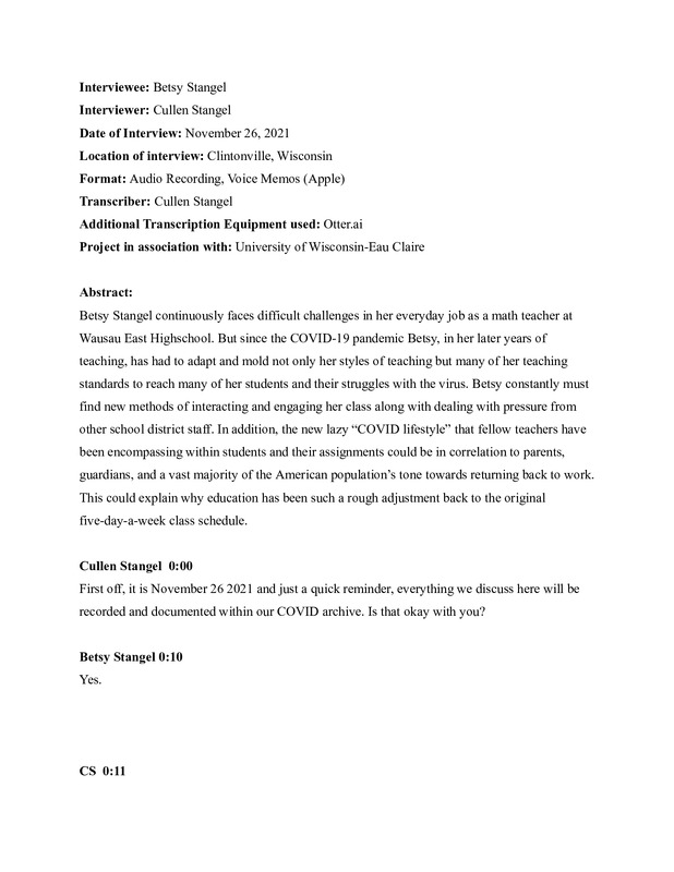 Betsy Stangel continuously faces difficult challenges in her everyday job as a math teacher at Wausau East Highschool. But since the COVID-19 pandemic Betsy, in her later years of teaching, has had to adapt and mold not only her styles of teaching but many of her teaching standards to reach many of her students and their struggles with the virus. Betsy constantly must find new methods of interacting and engaging her class along with dealing with pressure from other school district staff. In addition, the new lazy “COVID lifestyle” that fellow teachers have been encompassing within students and their assignments could be in correlation to parents, guardians, and a vast majority of the American population’s tone towards returning back to work. This could explain why education has been such a rough adjustment back to the original five-day-a-week class schedule.
