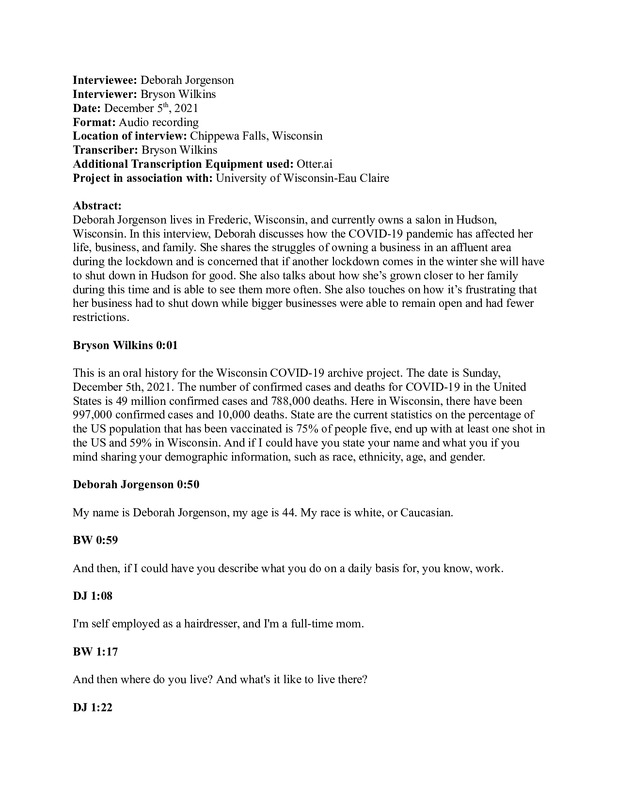 Deborah Jorgenson lives in Frederic, Wisconsin, and currently owns a salon in Hudson, Wisconsin. In this interview, Deborah discusses how the COVID-19 pandemic has affected her life, business, and family. She shares the struggles of owning a business in an affluent area during the lockdown and is concerned that if another lockdown comes in the winter she will have to shut down in Hudson for good. She also talks about how she’s grown closer to her family during this time and is able to see them more often. She also touches on how it’s frustrating that her business had to shut down while bigger businesses were able to remain open and had fewer restrictions.