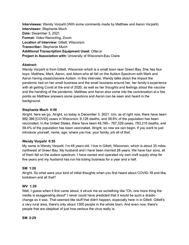 Wendy Vorpahl is from Gillett, Wisconsin which is a small town near Green Bay. She has four boys: Matthew, Mark, Aaron, and Adam who all fall on the Autism Spectrum with Mark and Aaron having classic/severe Autism. In this interview, Wendy talks about the impact the pandemic had on her small business and the small business around her, her family’s experience with all getting Covid at the end of 2020, as well as her thoughts and feelings about the vaccine and the handling of the pandemic. Matthew and Aaron also come into the conversation at a few points as Matthew answers some questions and Aaron can be seen and heard in the background.