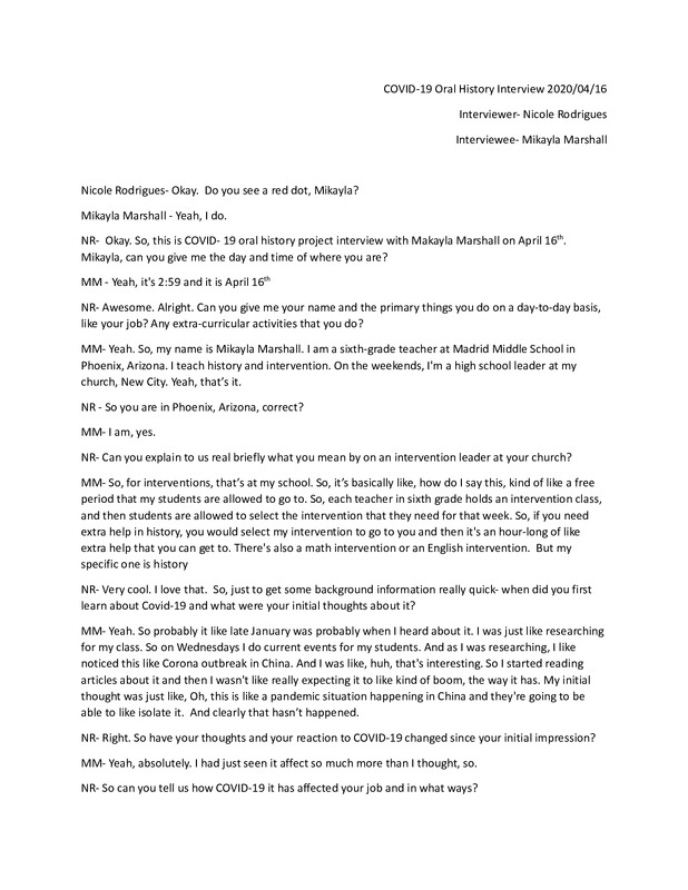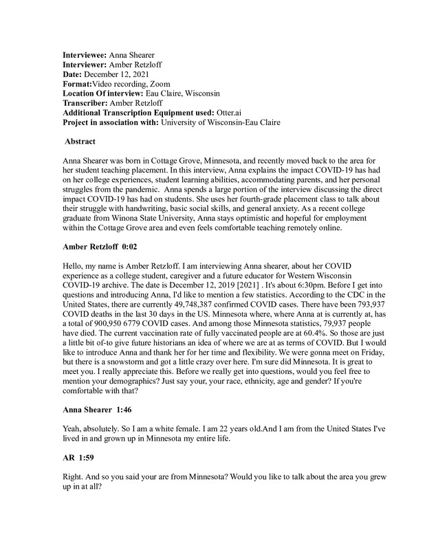 Anna Shearer was born in Cottage Grove, Minnesota, and recently moved back to the area for her student teaching placement. In this interview, Anna explains the impact COVID-19 has had on her college experiences, student learning abilities, accommodating parents, and her personal struggles from the pandemic. Anna spends a large portion of the interview discussing the direct impact COVID-19 has had on students. She uses her fourth-grade placement class to talk about their struggle with handwriting, basic social skills, and general anxiety. As a recent college graduate from Winona State University, Anna stays optimistic and hopeful for employment within the Cottage Grove area and even feels comfortable teaching remotely online.