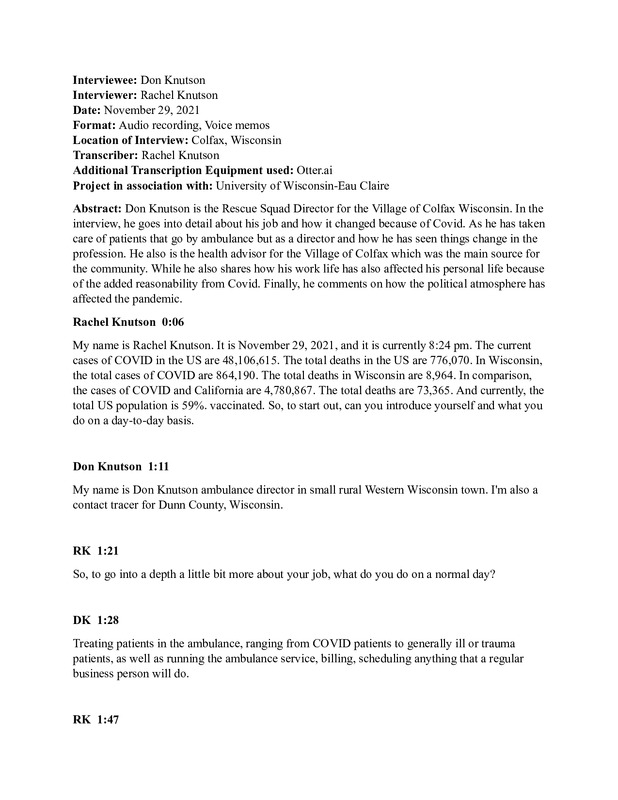 Don Knutson is the Rescue Squad Director for the Village of Colfax Wisconsin. In the interview, he goes into detail about his job and how it changed because of Covid. As he has taken care of patients that go by ambulance but as a director and how he has seen things change in the profession. He also is the health advisor for the Village of Colfax which was the main source for the community. While he also shares how his work life has also affected his personal life because of the added reasonability from Covid. Finally, he comments on how the political atmosphere has affected the pandemic.