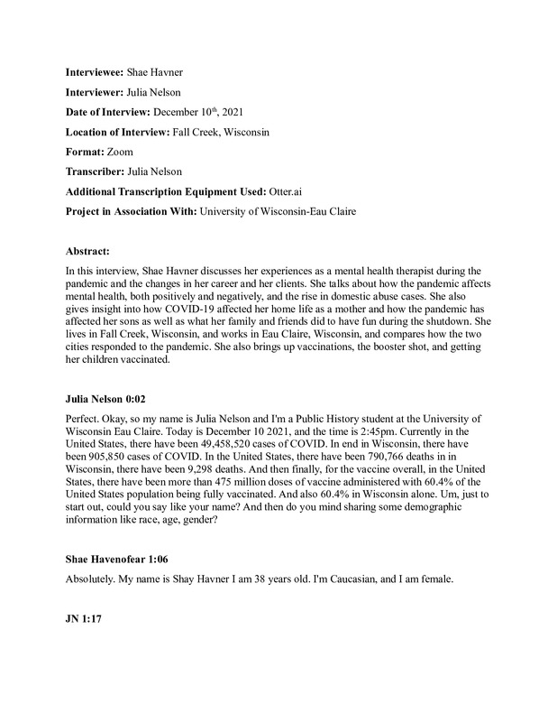 In this interview, Shae Havner discusses her experiences as a mental health therapist during the pandemic and the changes in her career and her clients. She talks about how the pandemic affects mental health, both positively and negatively, and the rise in domestic abuse cases. She also gives insight into how COVID-19 affected her home life as a mother and how the pandemic has affected her sons as well as what her family and friends did to have fun during the shutdown. She lives in Fall Creek, Wisconsin, and works in Eau Claire, Wisconsin, and compares how the two cities responded to the pandemic. She also brings up vaccinations, the booster shot, and getting her children vaccinated.