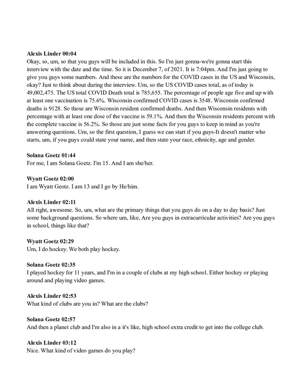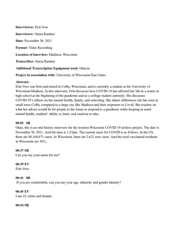 Erin Voss was born and raised in Colby, Wisconsin, and is currently a student at the University of Wisconsin-Madison. In this interview, Erin discusses how COVID-19 has affected her life as a senior in high school at the beginning of the pandemic and as a college student currently. She discusses COVID-19’s effects on her mental health, family, and schooling. She shares differences she has seen in small town Colby compared to a large city like Madison and their responses to Covid. She touches on what her advice would be for people in the future to respond to a pandemic while keeping in mind mental health, students’ ability to learn, and cautions to take.