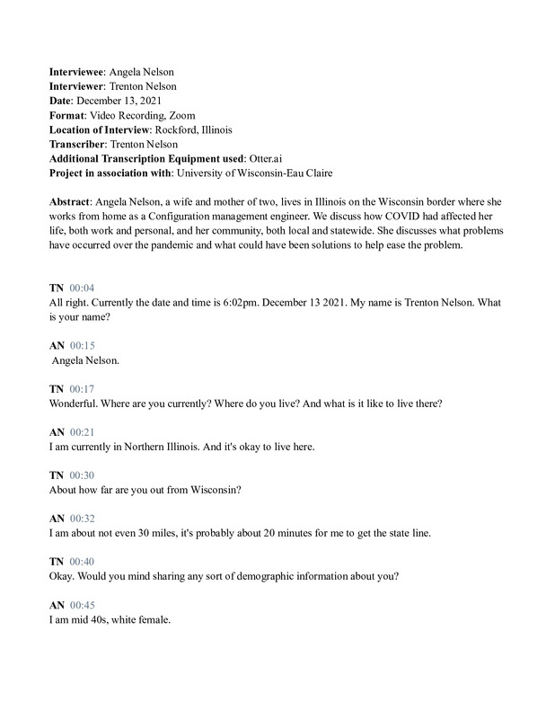 Angela Nelson, a wife and mother of two, lives in Illinois on the Wisconsin border where she works from home as a Configuration management engineer. We discuss how COVID had affected her life, both work and personal, and her community, both local and statewide. She discusses what problems have occurred over the pandemic and what could have been solutions to help ease the problem.