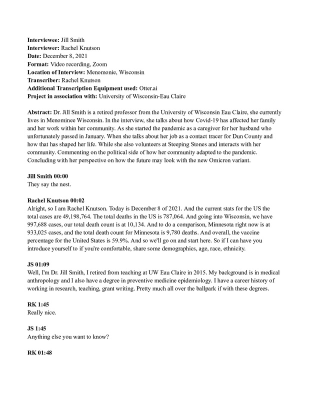 Dr. Jill Smith is a retired professor from the University of Wisconsin Eau Claire, she currently lives in Menominee Wisconsin. In the interview, she talks about how Covid-19 has affected her family and her work within her community. As she started the pandemic as a caregiver for her husband who unfortunately passed in January. When she talks about her job as a contact tracer for Dun County and how that has shaped her life. While she also volunteers at Steeping Stones and interacts with her community. Commenting on the political side of how her community adapted to the pandemic. Concluding with her perspective on how the future may look with the new Omicron variant.