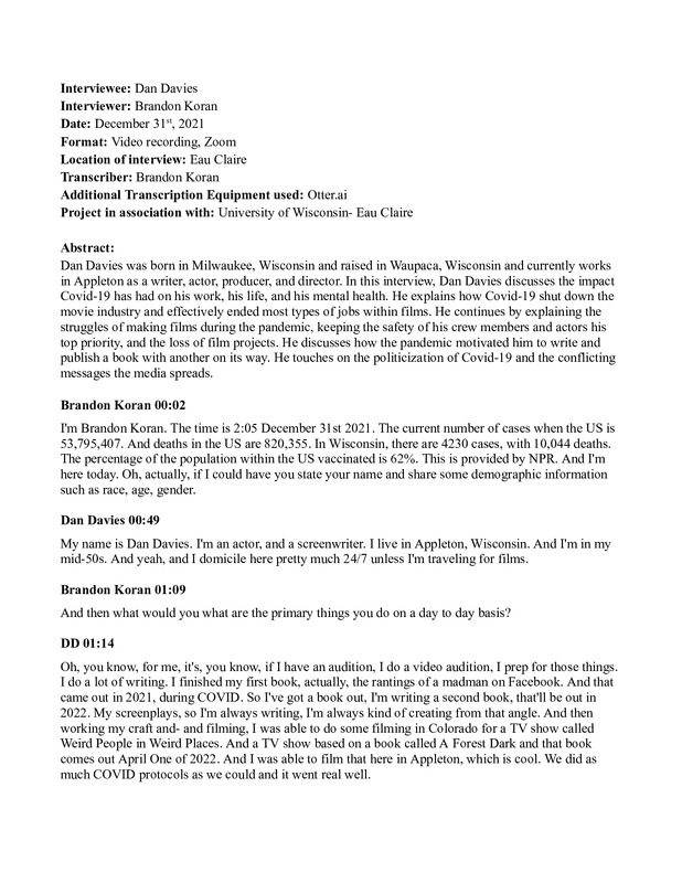 Dan Davies was born in Milwaukee, Wisconsin, raised in Waupaca, Wisconsin, and works in Appleton as a writer, actor, producer, and director. In this interview, Dan Davies discusses the impact Covid-19 has had on his work, life, and mental health. He explains how Covid-19 shut down the movie industry and effectively ended most types of jobs within films. He continues by explaining the struggles of making films during the pandemic, keeping the safety of his crew members and actors his top priority, and the loss of film projects. He discusses how the pandemic motivated him to write and publish a book with another on its way. He touches on the politicization of Covid-19 and the media's conflicting messages.