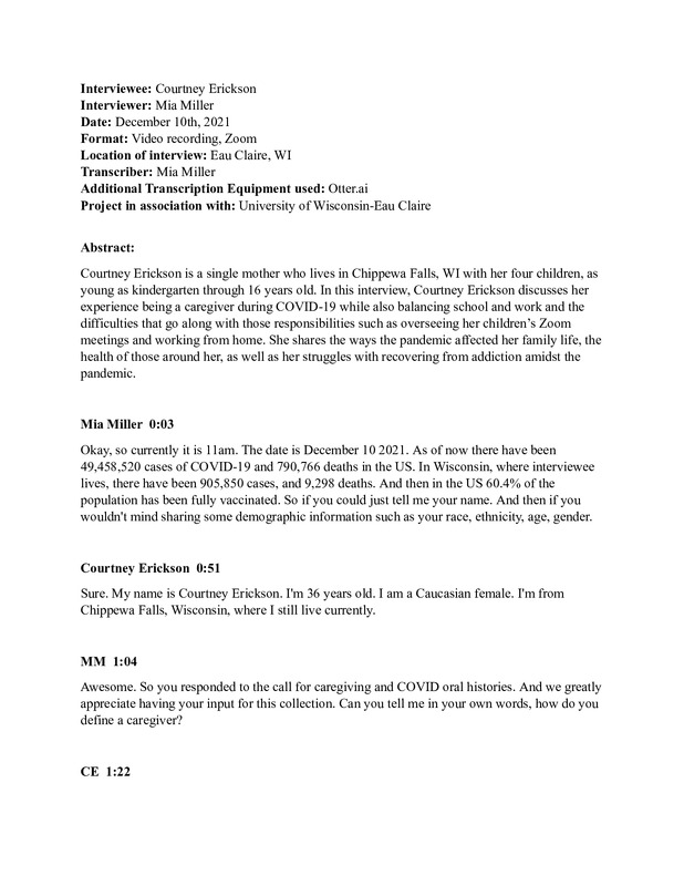 Courtney Erickson is a single mother who lives in Chippewa Falls, WI with her four children, as young as kindergarten through 16 years old. In this interview, Courtney Erickson discusses her experience being a caregiver during COVID-19 while also balancing school and work and the difficulties that go along with those responsibilities such as overseeing her children’s Zoom meetings and working from home. She shares the ways the pandemic affected her family life, the health of those around her, as well as her struggles with recovering from addiction amidst the pandemic.