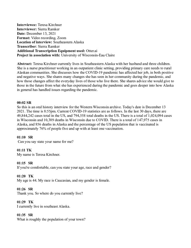 Teresa Kirchner currently lives in Southeastern Alaska with her husband and three children. She is a nurse practitioner working in an outpatient clinic setting, providing primary care needs to rural Alaskan communities. She discusses how the COVID-19 pandemic has affected her job, in both positive and negative ways. She shares many changes she has seen in her community during the pandemic, and how those changes affect the everyday lives of those who live there. She shares advice she would give to those in the future from what she has experienced during the pandemic and goes deeper into how Alaska in general has handled issues regarding the pandemic.
