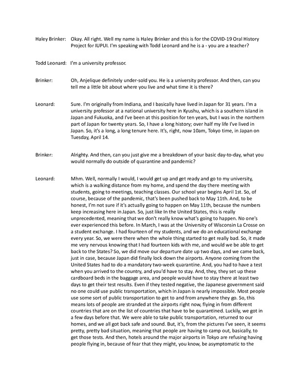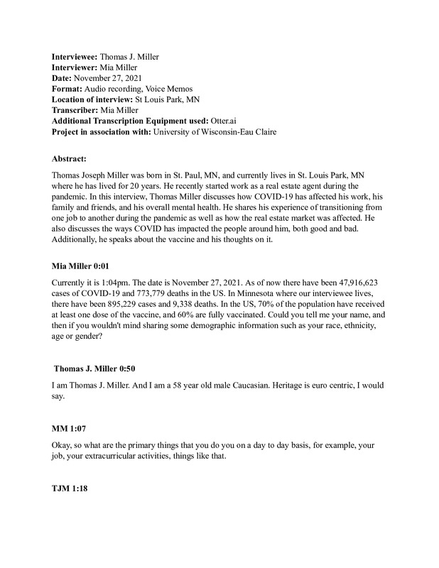 Thomas Joseph Miller was born in St. Paul, MN, and currently lives in St. Louis Park, MN where he has lived for 20 years. He recently started work as a real estate agent during the pandemic. In this interview, Thomas Miller discusses how COVID-19 has affected his work, his family and friends, and his overall mental health. He shares his experience of transitioning from one job to another during the pandemic as well as how the real estate market was affected. He also discusses the ways COVID has impacted the people around him, both good and bad. Additionally, he speaks about the vaccine and his thoughts on it.