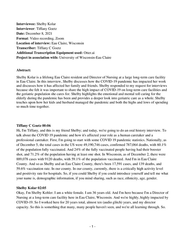 Shelby Kolar is a lifelong Eau Claire resident and Director of Nursing at a large long-term care facility in Eau Claire. In this interview, Shelby discusses how the COVID-19 pandemic has impacted her work and discusses how it has affected her family and friends. Shelby responded to my interview request because she felt it was important to share the high impact of COVID-19 on long-term care facilities and