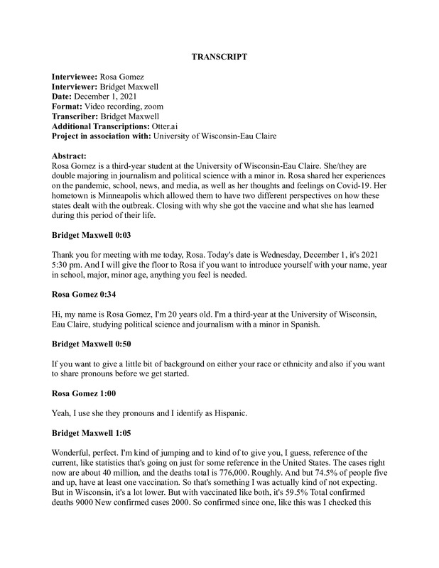 Rosa Gomez is a third-year student at the University of Wisconsin-Eau Claire. She/they are double majoring in journalism and political science with a minor in. Rosa shared her experiences on the pandemic, school, news, and media, as well as her thoughts and feelings on Covid-19. Her hometown is Minneapolis which allowed them to have two different perspectives on how these states dealt with the outbreak. Closing with why she got the vaccine and what she has learned during this period of their life.