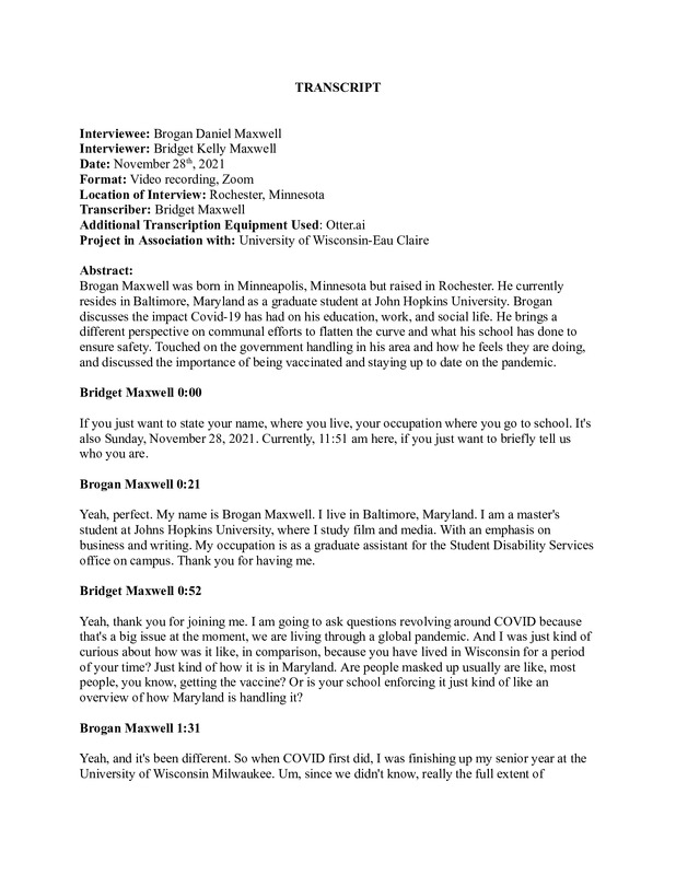 Brogan Maxwell was born in Minneapolis, Minnesota but raised in Rochester. He currently resides in Baltimore, Maryland as a graduate student at John Hopkins University. Brogan discusses the impact Covid-19 has had on his education, work, and social life. He brings a different perspective on communal efforts to flatten the curve and what his school has done to ensure safety. Touched on the government handling in his area and how he feels they are doing, and discussed the importance of being vaccinated and staying up to date on the pandemic.