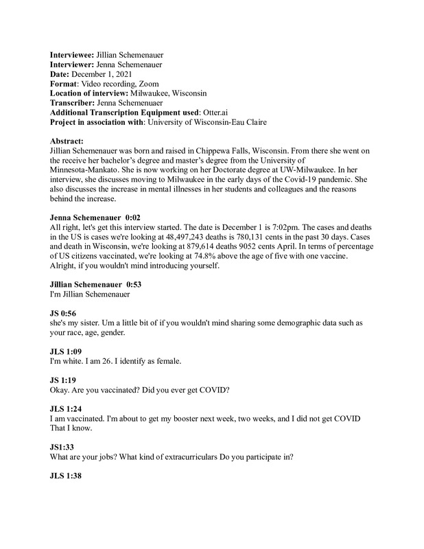 Jillian Schemenauer was born and raised in Chippewa Falls, Wisconsin. From there she went on the receive her bachelor’s degree and master’s degree from the University of Minnesota-Mankato. She is now working on her Doctorate degree at UW-Milwaukee. In her interview, she discusses moving to Milwaukee in the early days of the Covid-19 pandemic. She also discusses the increase in mental illnesses in her students and colleagues and the reasons behind the increase.