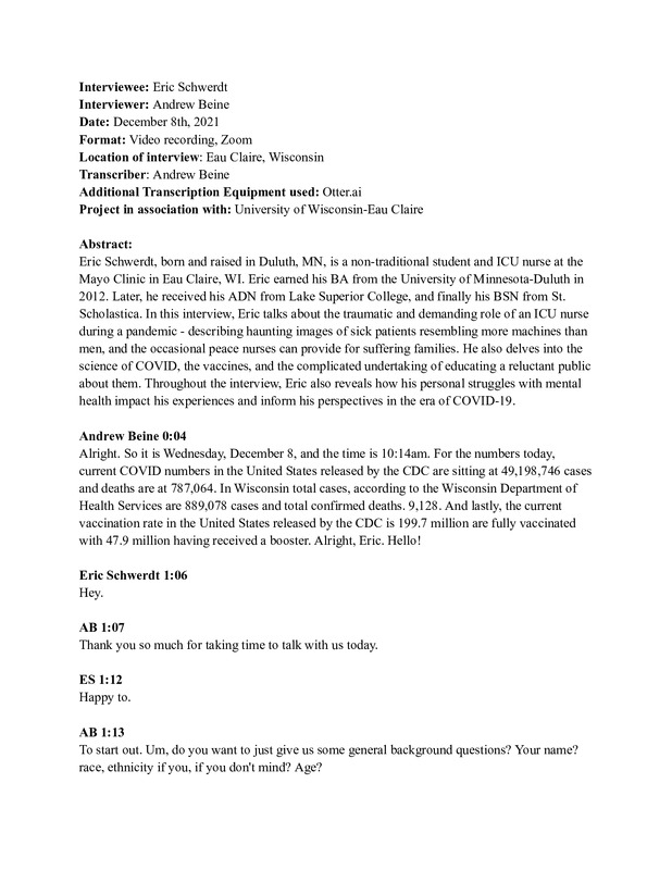 Eric Schwerdt, born and raised in Duluth, MN, is a non-traditional student and ICU nurse at the Mayo Clinic in Eau Claire, WI. Eric earned his BA from the University of Minnesota-Duluth in 2012. Later, he received his ADN from Lake Superior College, and finally his BSN from St. Scholastica. In this interview, Eric talks about the traumatic and demanding role of an ICU nurse during a pandemic - describing haunting images of sick patients resembling more machines than men, and the occasional peace nurses can provide for suffering families. He also delves into the science of COVID, the vaccines, and the complicated undertaking of educating a reluctant public about them. Throughout the interview, Eric also reveals how his personal struggles with mental health impact his experiences and inform his perspectives in the era of COVID-19.