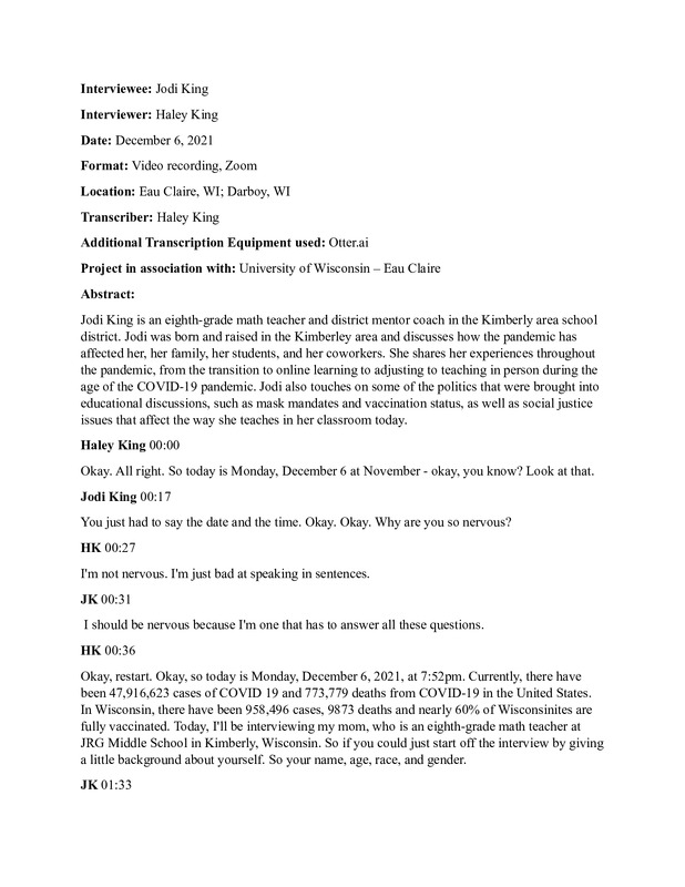 Jodi King is an eighth-grade math teacher and district mentor coach in the Kimberly area school district. Jodi was born and raised in the Kimberly area and discusses how the pandemic has affected her, her family, her students, and her coworkers. She shares her experiences throughout the pandemic, from the transition to online learning to adjusting to teaching in person during the age of the COVID-19 pandemic. Jodi also touches on some of the politics that were brought into educational discussions, such as mask mandates and vaccination status, as well as social justice issues that affect the way she teaches in her classroom today.