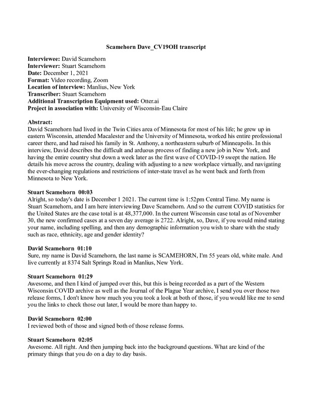 David Scamehorn had lived in the Twin Cities area of Minnesota for most of his life; he grew up in eastern Wisconsin, attended Macalester and the University of Minnesota, worked his entire professional career there, and had raised his family in St. Anthony, a northeastern suburb of Minneapolis. In this interview, David describes the difficult and arduous process of finding a new job in New York, and having the entire country shut down a week later as the first wave of COVID-19 swept the nation. He details his move across the country, dealing with adjusting to a new workplace virtually, and navigating the ever-changing regulations and restrictions of inter-state travel as he went back and forth from Minnesota to New York.