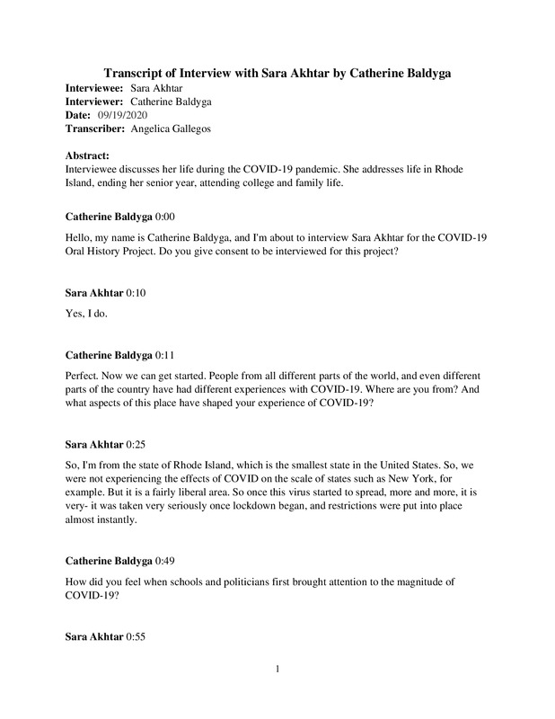 Interviewee discusses her life during the COVID-19 pandemic. She addresses life in Rhode Island, ending her senior year, attending college and family life. The audio recording I uploaded is my classmate's experience with COVID-19.