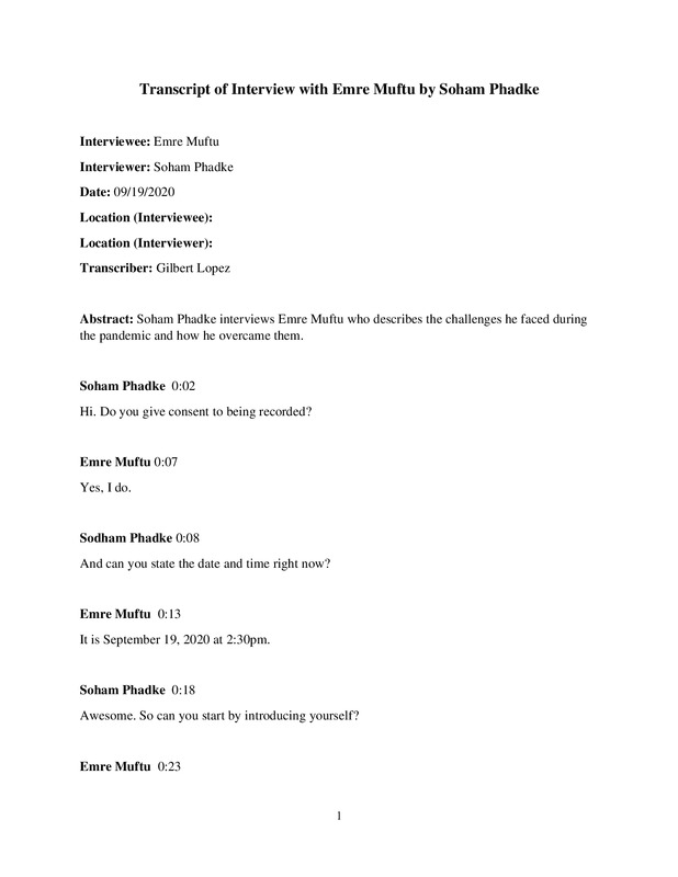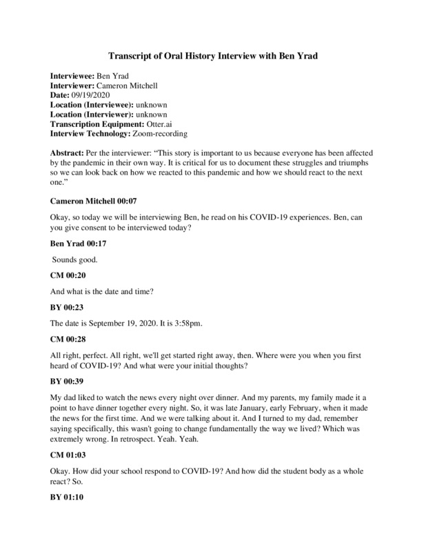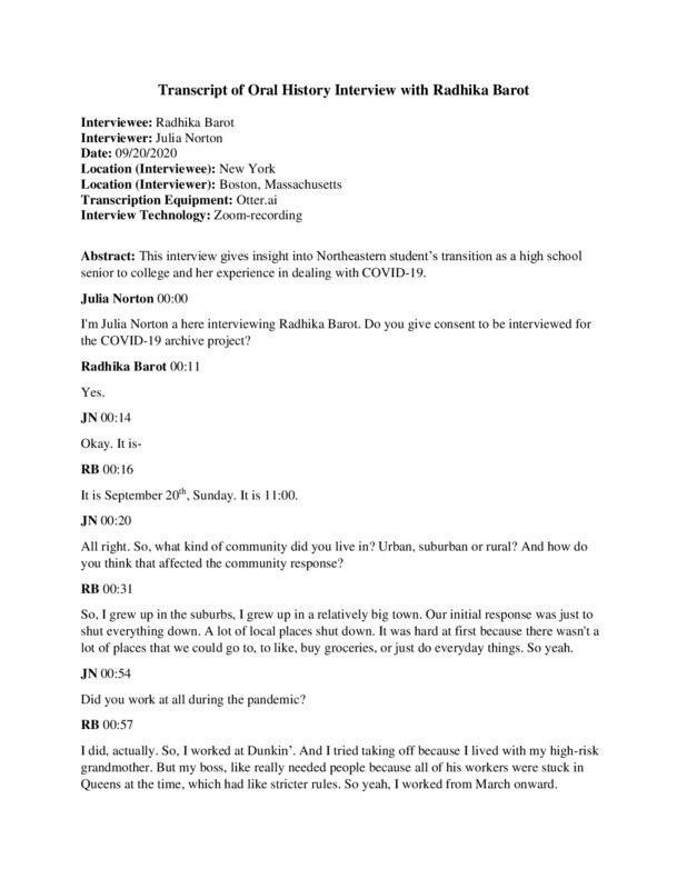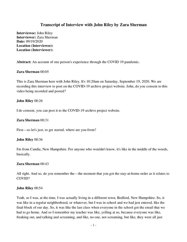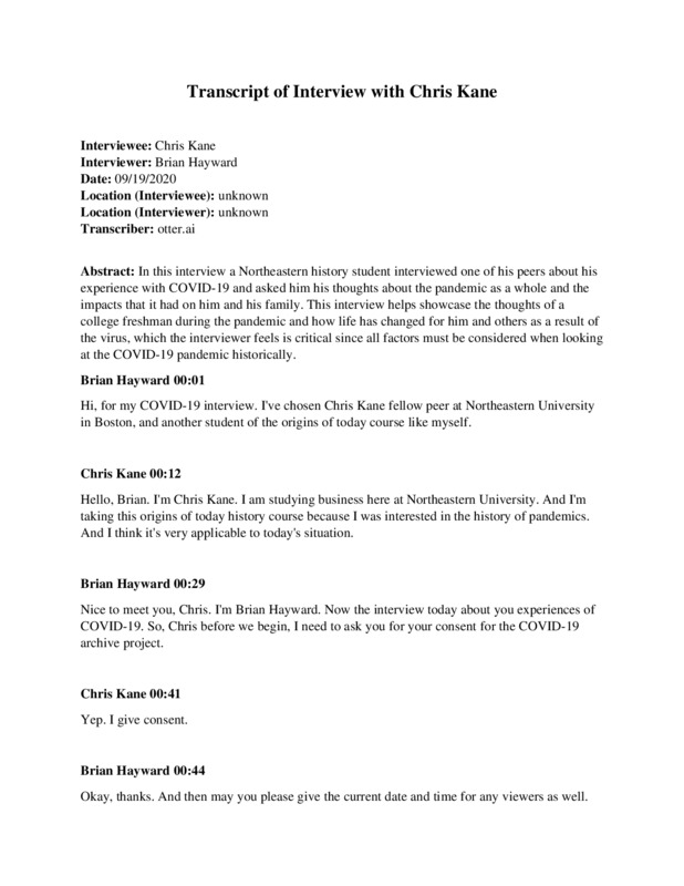 In this interview, I (a Northeastern history student) interviewed one of my peers about his experience with covid-19, and asked him his thoughts about the pandemic as a whole and the impacts that it had on him and his family. This interview helps showcase the thoughts of a college freshman during the pandemic and how life has changed for him and others as a result of the virus, which I feel is critical since all factors must be considered when looking at the covid-19 pandemic historically.