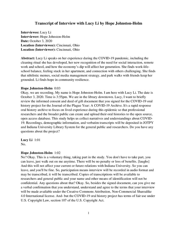 Lucy Li speaks on her experience during the COVID-19 pandemic, including the cleaning ritual she has developed, her new recognition of the need for social interaction, remote work and school, and how the economy’s dip will affect her generation. She finds work-life-school balance, feeling stuck in her apartment, and connection with others challenging. She finds that nihilistic memes, social media management strategy, and park walks with friends keep her grounded. Li finds hope in community resilience.
