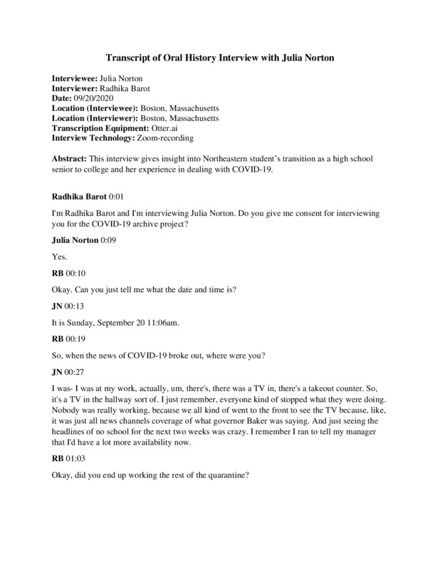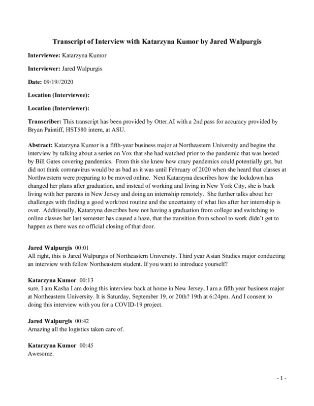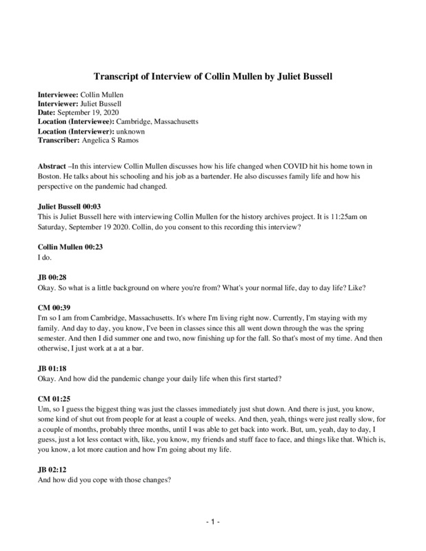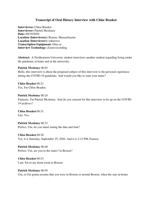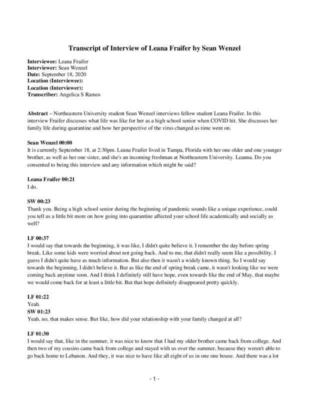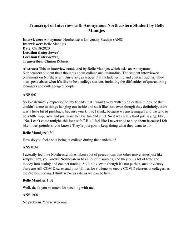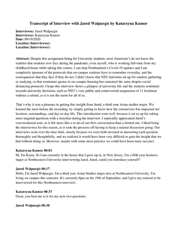 This interview was conducted and uploaded for the purposed of a class at Northeastern University centered around the study of pandemics. This interview goes a bit into the experiences of a college student during their last semester before graduation. It is focused largely on interning before graduation and transitioning from student to working adult.