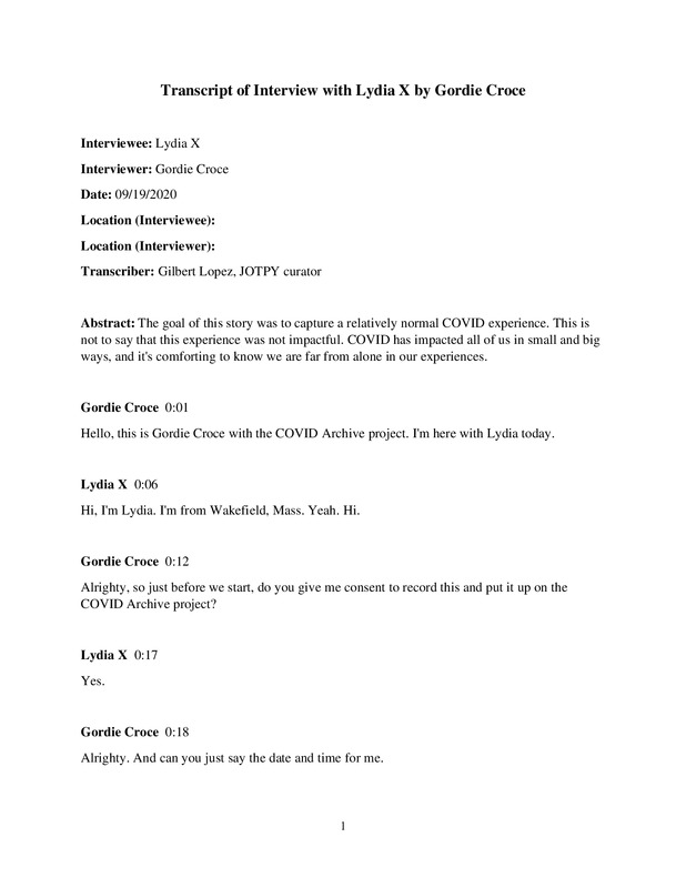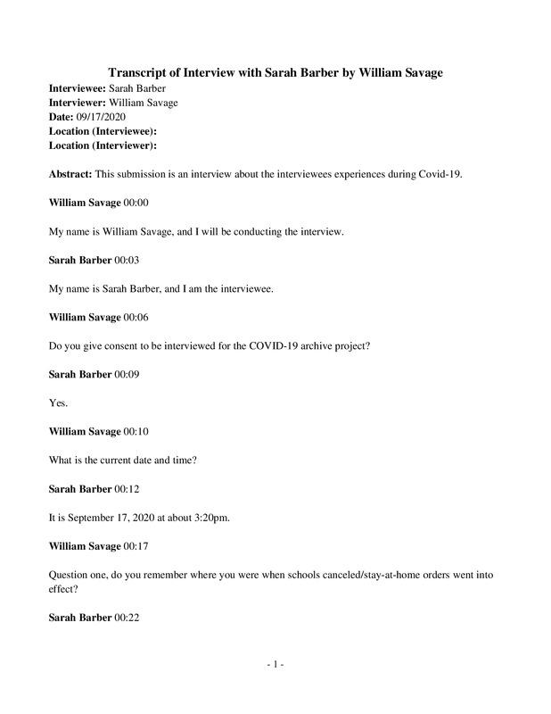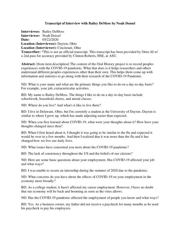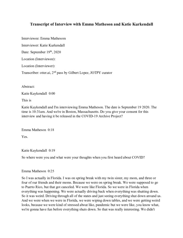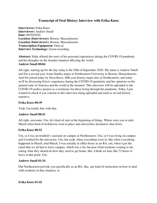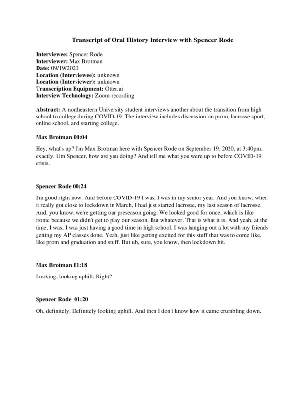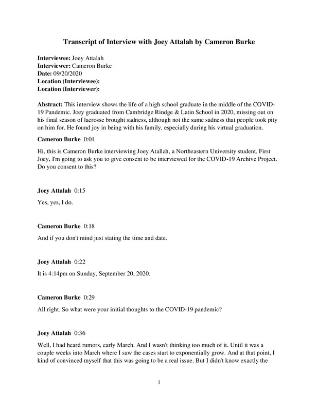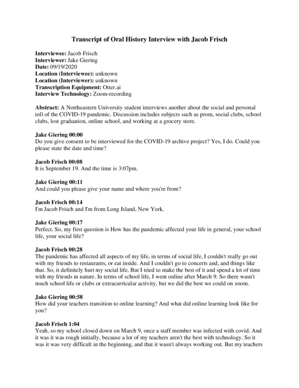 This interview was conducted and uploaded for the purposed of a class at Northeastern University centered around the study of pandemics. This interview goes a bit into the experiences of a college student during their last semester before graduation. It is focused largely on interning before graduation and transitioning from student to working adult.