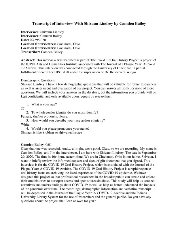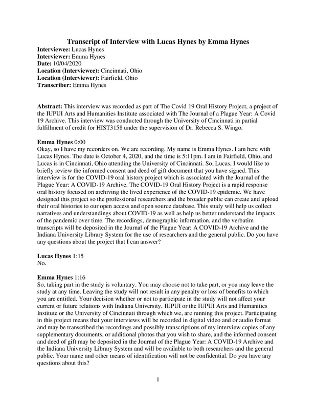 In this Oral history, I interviewed my brother Lucas about his experiences during the COVID-19 pandemic. He is a freshman at the University of Cincinnati, and the interview focuses on that part of his identity. It begins with us talking about campus life in general. We also discussed his perceptions of COVID-19 both at the beginning of the pandemic and now. His perceptions have not changed much, although he believes that it’s important to listen to scientists as new information is released. We then talked about government response to COVID-19, as well as the response at the University of Cincinnati. Finally, he discussed things he felt he has missed out on because of the pandemic, and what he thinks school will look like going forward.