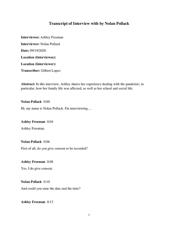 In this interview, Ashley shares her experience dealing with the pandemic; in particular, how her family life was affected, as well as her school and social life.
