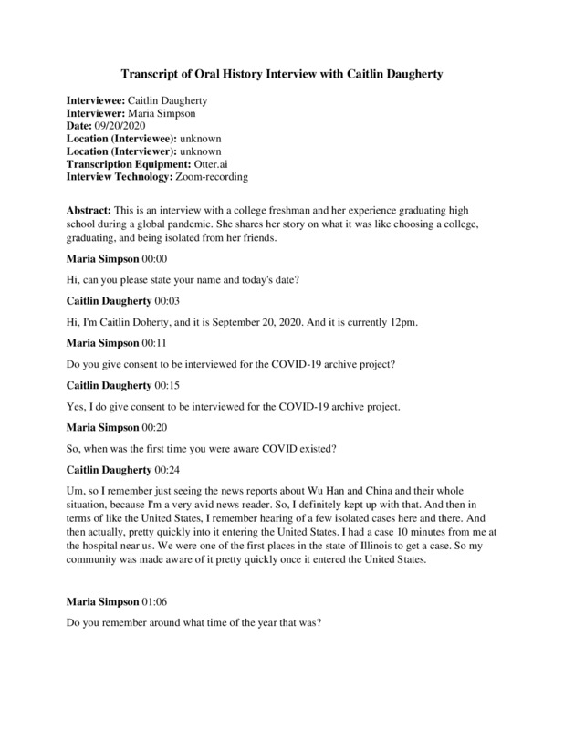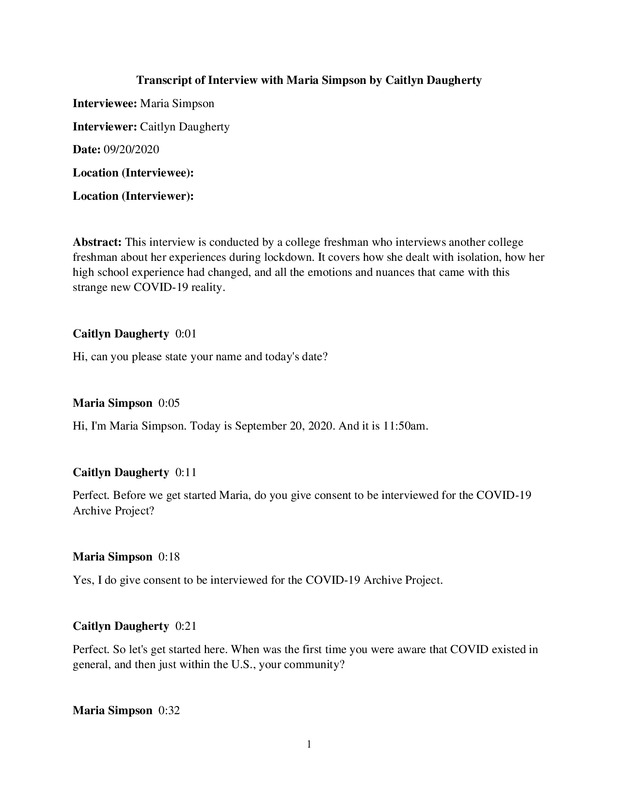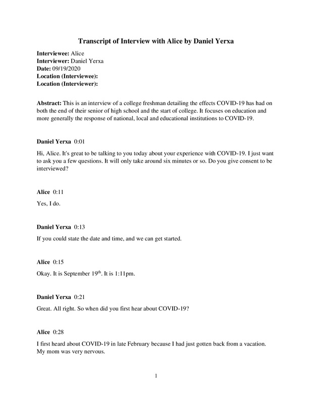 This is an interview of a college freshman detailing the effects COVID-19 has had on both the end of their senior of high school and the start of college. It focuses on education and more generally the response of national, local and educational institutions to COVID-19.