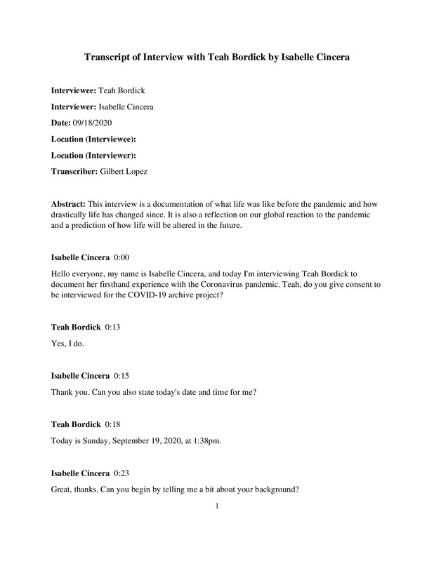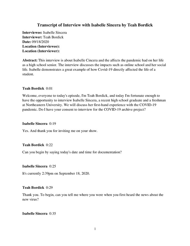 This interview is about Isabelle Cincera and the affects the pandemic had on her life as a high school senior. The interview discusses the impacts such as online school and her social life. Isabelle demonstrates a great example of how Covid-19 directly affected the life of a student.