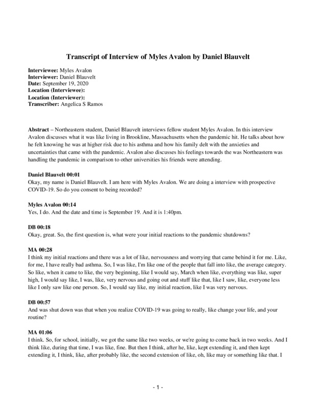 Northeastern student, Daniel Blauvelt interviews fellow student Myles Avalon. In this interview Avalon discusses what it was like living in Brookline, Massachusetts when the pandemic hit. He talks about how he felt knowing he was at higher risk due to his asthma and how his family delt with the anxieties and uncertainties that came with the pandemic. Avalon also discusses his feelings towards the was Northeastern was handling the pandemic in comparison to other universities his friends were attending.