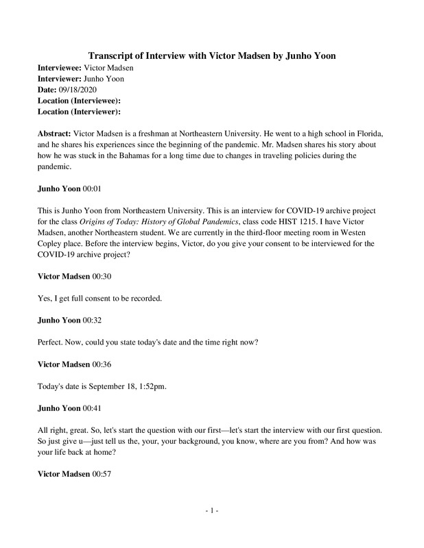 Victor Madsen is a freshman at Northeastern University. He went to a high school in Florida, and he shares his experiences since the beginning of the pandemic. Mr. Madsen shares his story about how he was stuck in the Bahamas for a long time due to changes in traveling policies during the pandemic.