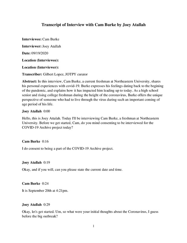 In this interview, Cam Burke, a current freshman at Northeastern University, shares his personal experiences with covid-19. Burke expresses his feelings dating back to the begining of the pandemic, and explains how it has impacted him leading up to today. As a high school senior and rising college freshman during the height of the coronavirus, Burke offers the unique perspective of someone who had to live through the virus during such an important coming of age period of his life.