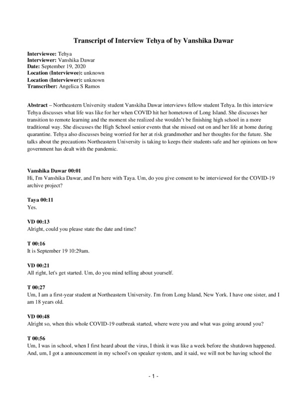 Interview goes over Tehya's personal experiences with the pandemic, from graduating her senior year to starting college as a freshman.