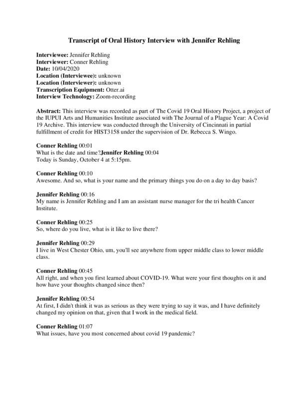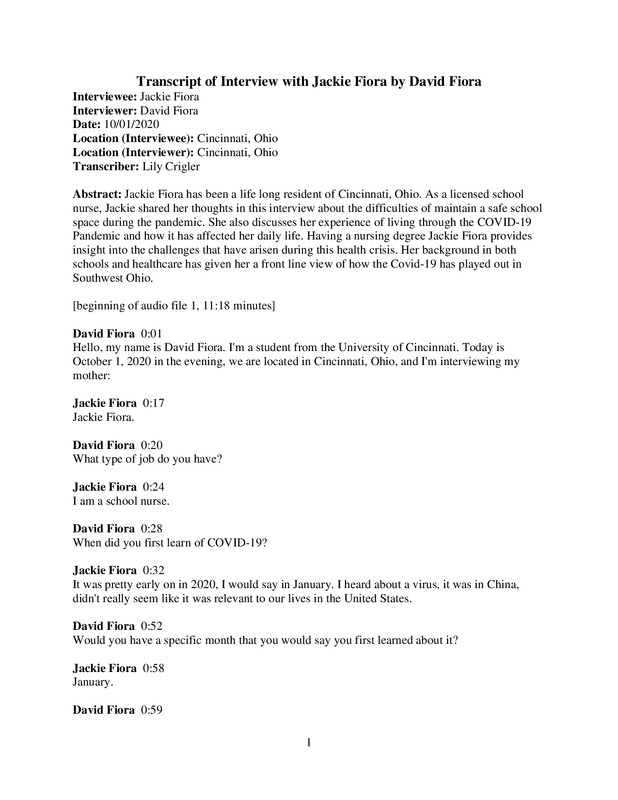 Jackie Fiora has been a life long resident of Cincinnati, Ohio. As a licensed school nurse, Jackie shared her thoughts in this interview about the difficulties of maintain a safe school space during the pandemic. She also discusses her experience of living through the COVID-19 Pandemic and how it has affected her daily life. Having a nursing degree Jackie Fiora provides insight into the challenges that have arisen during this health crisis. Her background in both schools and healthcare has given her a front line view of how the Covid-19 has played out in Southwest Ohio.