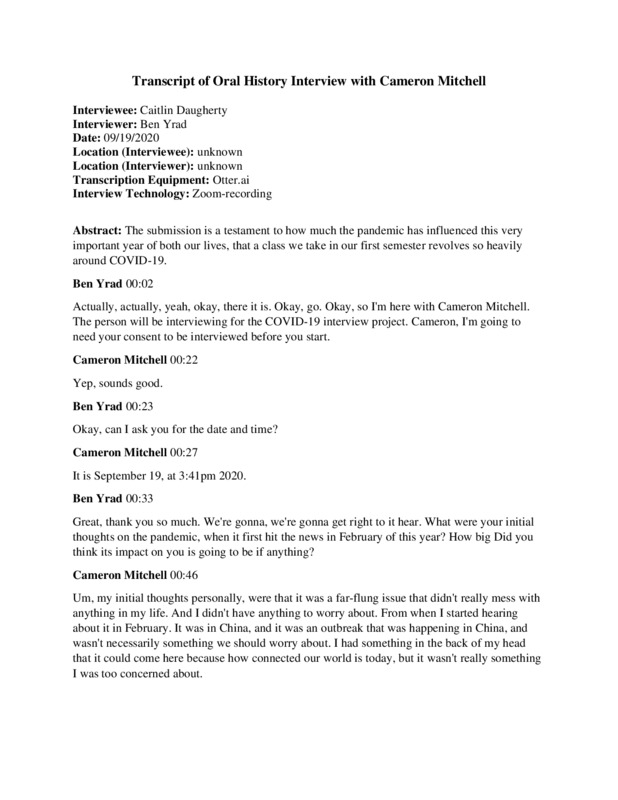 The submission is a testament to how much the pandemic has influenced this very important year of both our lives, that a class we take in our first semester revolves so heavily around COVID-19. This is an audio file of my interview with fellow Northeastern University student Cameron Mitchell, for our History 1215 class.
