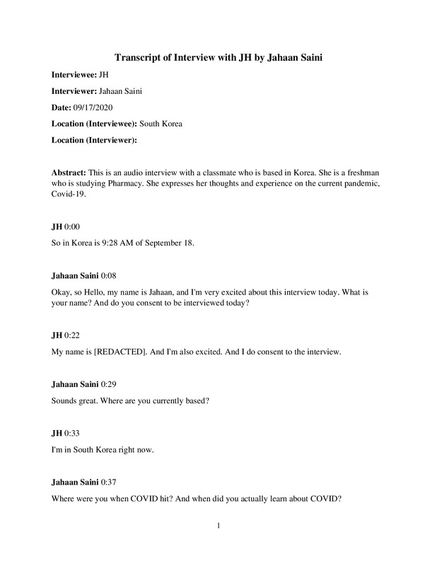 This is an audio interview with a classmate who is based in Korea. She is a freshman who is studying Pharmacy. She expresses her thoughts and experience on the current pandemic, Covid-19.