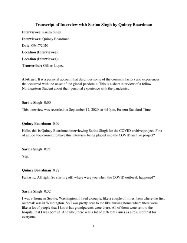 It is a personal account that describes some of the common factors and experiences that occurred with the onset of the global pandemic. This is a short interview of a fellow Northeastern Student about their personal experience with the pandemic.
