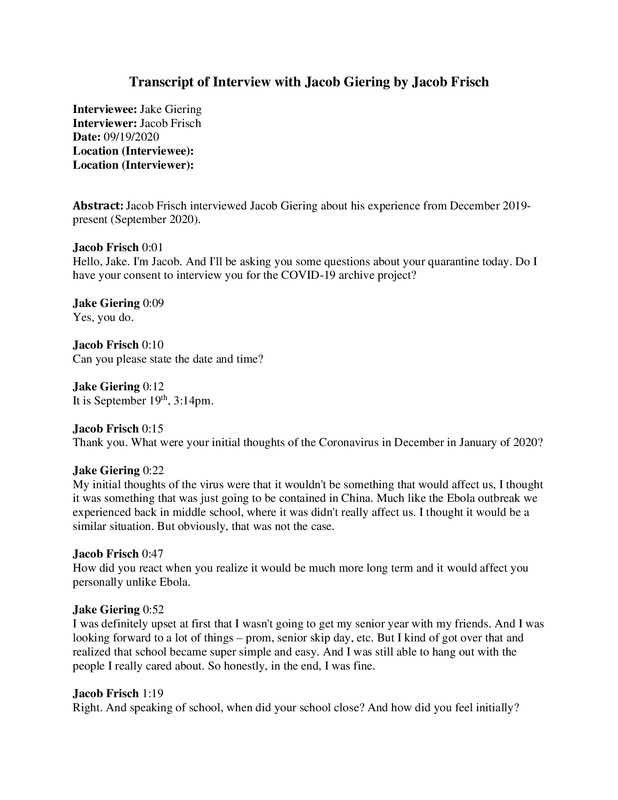 I interviewed Jacob about his experience from December 2019-present (September 2020)